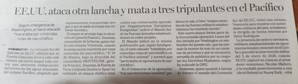 Sin presentar pruebas, la Casa Blanca asegura que todos ellos eran narcoterroristas transportando drogas que terminan matando estadounidenses. A eso lo llama «legítima defensa«. La Carta de las Naciones Unidas es clara. Prohíbe el uso de la fuerza armada en las relaciones internacionales, pero contempla dos excepciones: Una, las intervenciones autorizadas por el Consejo de Seguridad, que no es el caso, y dos, la legítima defensa ante un ataque armado que, evidentemente, tampoco es el caso. La Constitución americana dice que es el Congreso quien declara la guerra, pero allí no se ha votado el uso de la fuerza armada. No es la primera vez que este debate surge en el país. Ya hubo presidentes republicanos y demócratas que usaron drones en Pakistán, Yemen, Libia para matar a presuntos terroristas. Quizá la diferencia es el descaro con el que ese «señor» admite lo que muchos consideran ejecuciones extrajudiciales, para que se me entienda mejor, son asesinatos y si, como él dice «estamos en guerra contra el narcotráfico«, son crímenes de guerra.